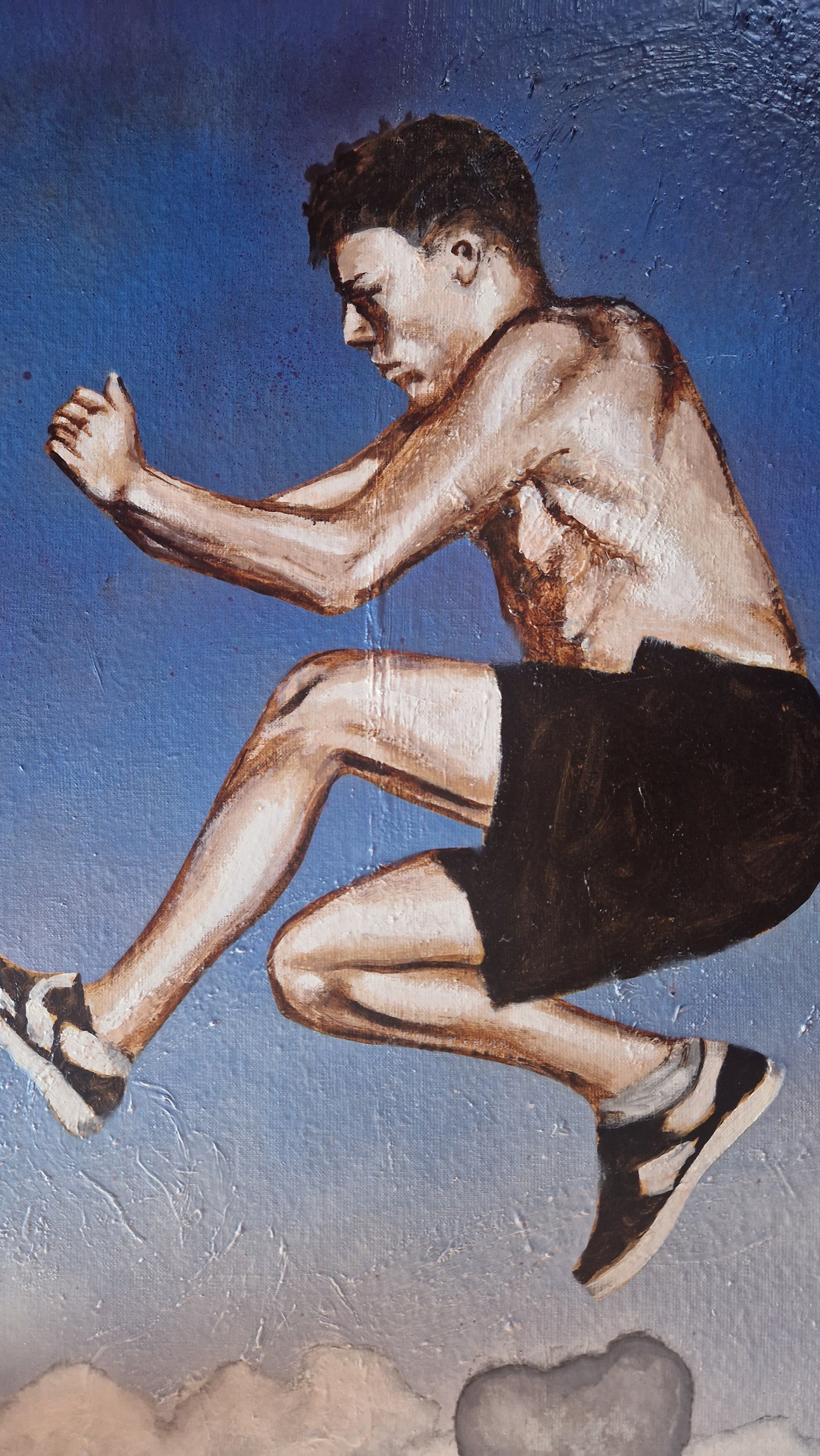 Dette store maleriet av Trond Berg-Nilssen fanger et øyeblikk av dynamisk bevegelse og frihet. Figuren som svever over skyene, gir en følelse av vektløshet og drøm. Det klare blå i bakgrunnen forsterker følelsen av himmel og ubegrenset rom. Skyenes myke teksturer kontrasterer med den klare, presise formen til kroppen i bevegelse, noe som gir verket en harmonisk balanse. Samtidig setter den fjerne, nesten skyggeaktige figuren et preg av mystikk og refleksjon over menneskelig frihet og ambisjon. Verket inspirerer til å tenke på muligheter og grensen for menneskelige potensialer. Oil on canvas. 100x70 cm.